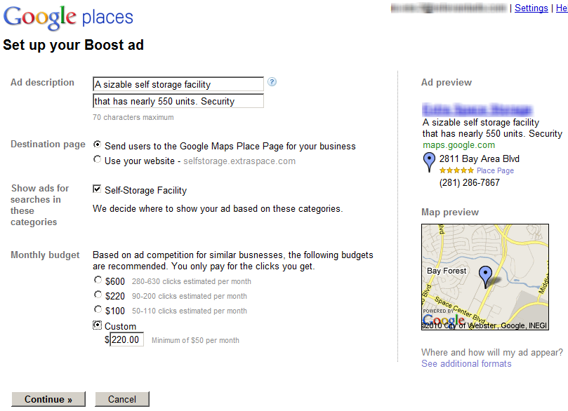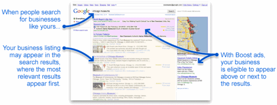 For more information, visit the Google support page on Boost Ads. Of interest, an example screen shot on the support page shows a modified Google search result page that exclusively displays businesses, places and a map.