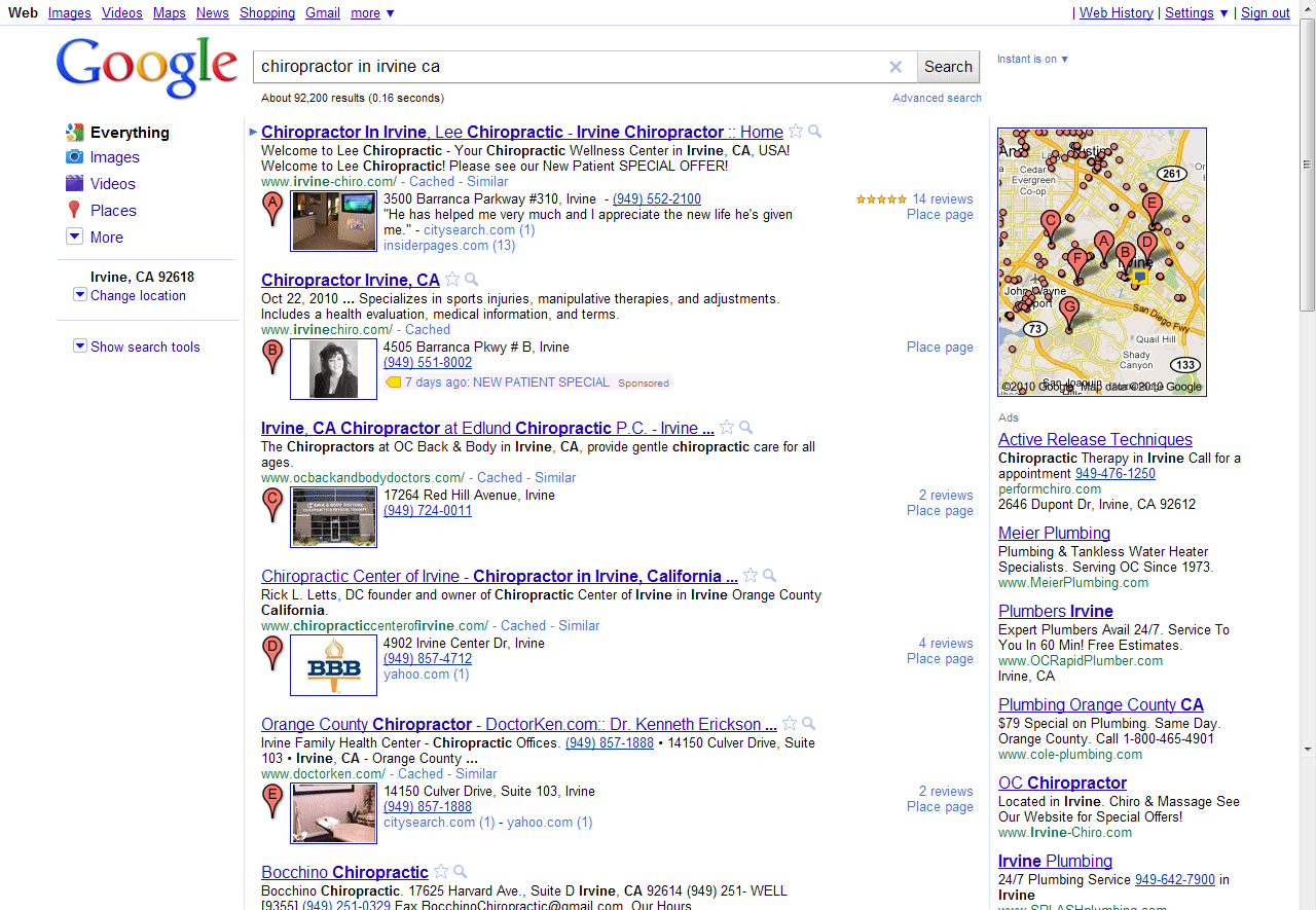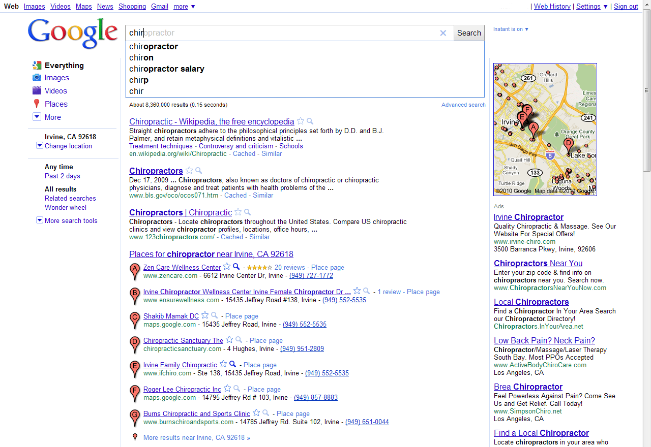 Now let’s look at a user who types “chiropractor in irvine ca,” perhaps because they are using their browser’s search box and are not presented with Place results after just four keystrokes. This query returns different results.