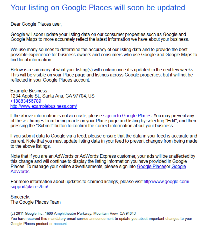 Google recently sent emails to many business owners notifying them that their Google Places information will be updated. The email (pictured below) shows the information that will be found on the updated Google Places page and urges business owners to log in to their Google Places account if the information presented is incorrect. At Local Splash, we keep our clients’ business information updated; however some of our clients still received this email. We were also puzzled by how Google obtained our customers’ personal email addresses that were never publicized. In order to answer these questions, we did some research and came up with the following possible explanations: